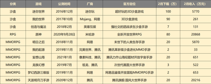 近几年10款较有代表性的开放世界手游,收入和下载数据来自sensortower