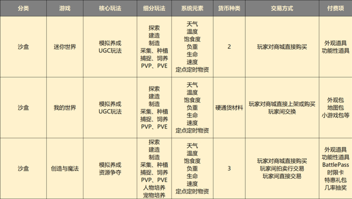 在沙盒基础玩法之后,《创造与魔法》添加了资源掠夺、人物、宠物培养、工会等MMORPG网游元素,游戏采用MMORPG最常用的3货币流通方式,支持玩家—商城、玩家—商城—玩家和玩家点对点交易三种交易方式。