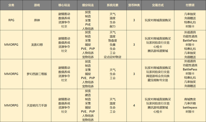 包括《原神》在内,RPG类开放世界手游的核心玩法还是数值成长和剧情推动,但细分玩法、系统元素较沙盒、生存类都更少,经济和付费设计延用经典的内购全家桶。开放世界对RPG尤其是MMO来说,并不影响核心,而只是一种“免费的、没啥压力的附加体验。”