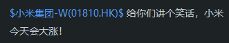 有牛友开盘就给大家“讲了个笑话,小米今天会大涨!”诶你还别先笑,小米为了不当笑话还真就涨了,大涨0.23%。