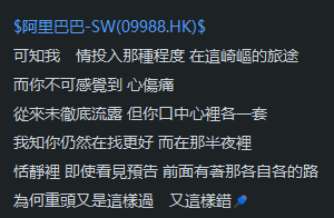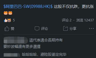 还有牛友无奈地表示阿里是:“众人皆醒你独醉。”异动狗仔细研究了下阿里这表现,后劲挺大,喝的酱香味?