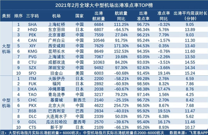 原标题:2月全球大型机场准点率TOP10发布,中国8家机场上榜