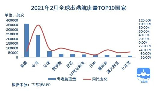 后疫情时代下,2月全球机场实际出港航班量为119.24万架次,同比下降48.74%;出港准点率为85.14%,同比提升5.24%。全球机场取消出港航班量为31.22万架次。2月全球实际出港航班量TOP10国家依次为美国、中国、印度、俄罗斯、巴西、印度尼西亚、日本、墨西哥、澳大利亚和土耳其。除中国航班量同比大幅提升外,其他国家仍呈负增长态势。