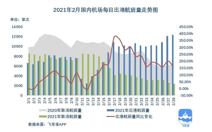 2月国内正处于春运时期,飞常准大数据显示,国内机场实际出港航班量为23.17万架次,同比上升127.98%,环比下降22.59%。其出港准点率为89.12%,同比下降5.34%。