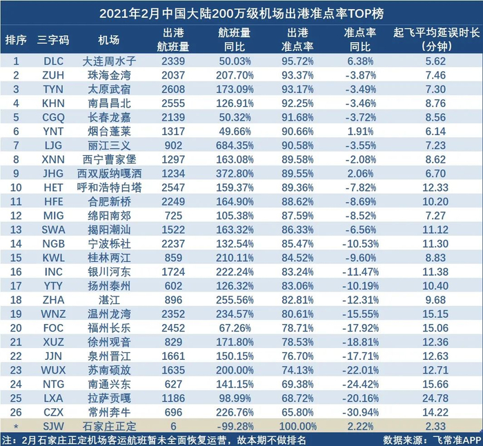 2月,中国大陆200万级机场准点率排名中,排名前三的机场分别是大连周水子机场、珠海金湾机场、太原武宿机场。