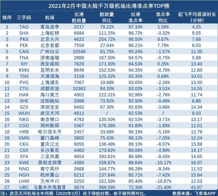 千万级机场:青岛流亭机场最准点广州白云机场航班量第一
