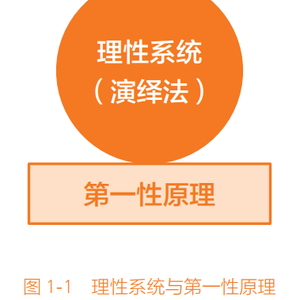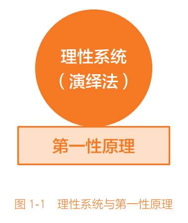 换句话说,任何理性系统内部都是用演绎法来推论的,而推论必须建立在第一性原理之上,我把它画成一个模型(见图 1-1)。这里我把第一性原理放在理性系统之外,它是系统的大前提,由它加上演绎法,推出整个理性系统。