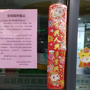 到处是大门紧闭。高思教育的玻璃门上贴着牛年的春联和福字,一把锁横在门把手上,左右各一张“疫情防控提示”,落款日期分别是1月23日和2月18日。