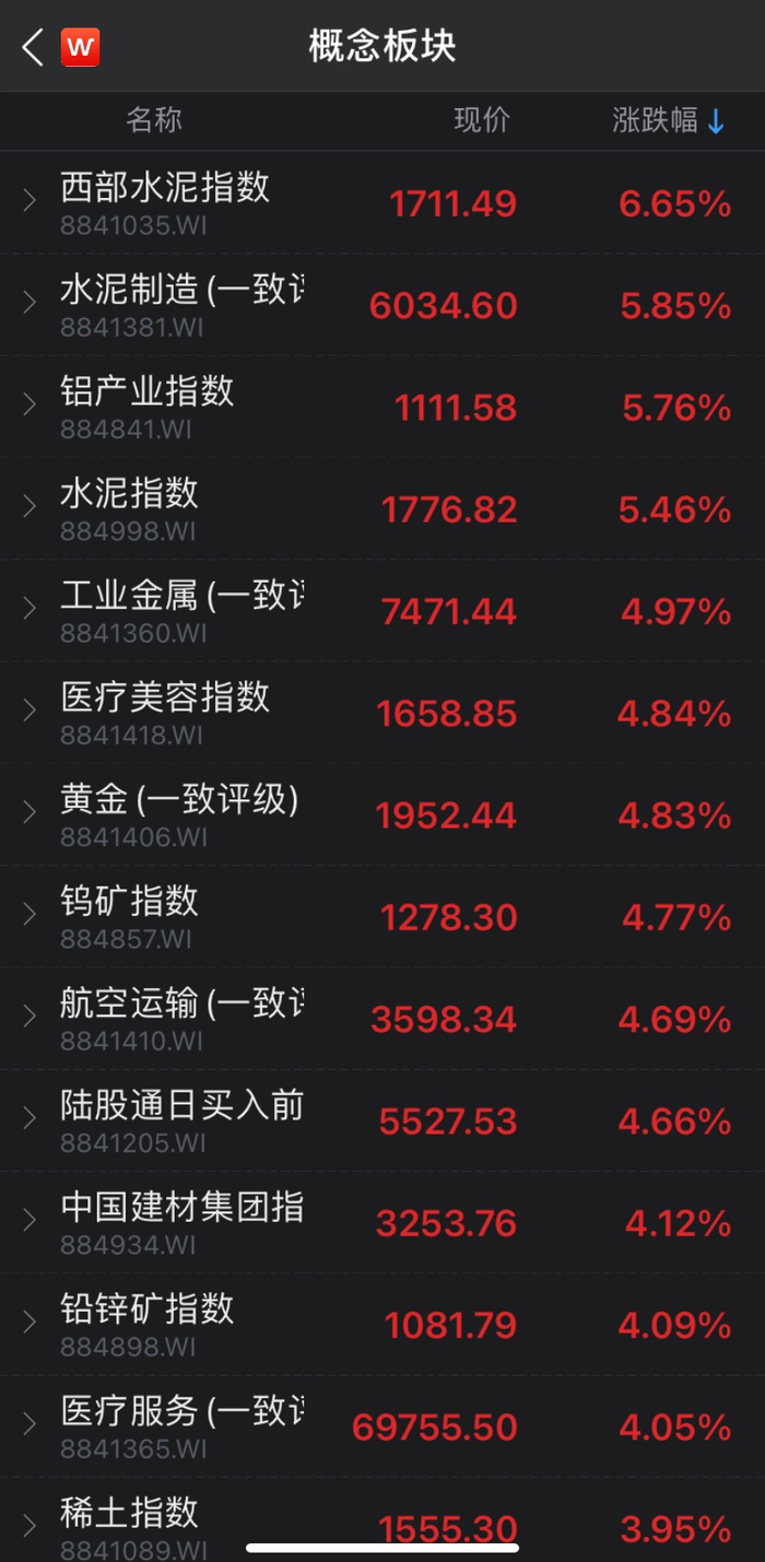Wind数据显示,截至午间收盘,西部水泥概念板块涨6.65%,领涨概念板块;水泥制造、铝产业概念板块均涨逾5%,钢铁概念板块涨逾3%,火电概念板块涨逾2%。