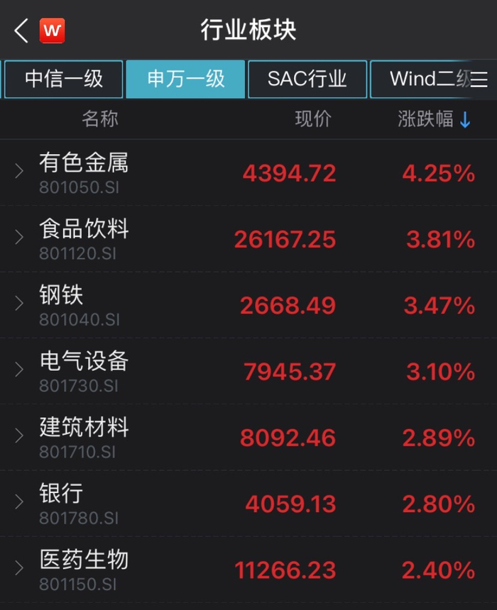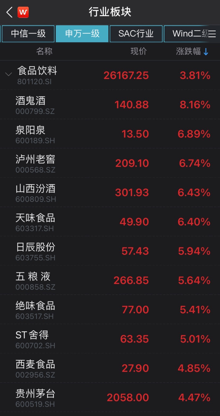 另外,白酒股盘中崛起,延续上一交易日涨势。申万一级行业板块中,食品饮料半日涨3.81%,涨幅仅次于有色金属板块。