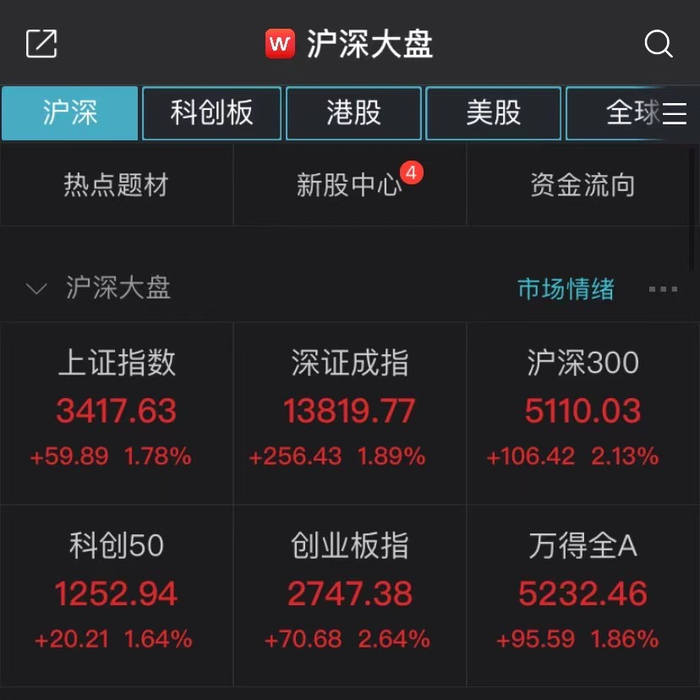 Wind数据显示,截至午间收盘,上证指数上涨1.78%,报3417.63点;深证成指上涨1.89%,报13819.77点;创业板指上涨2.64%,报2747.38点。