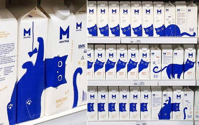 将时间线拉回当下日常,谈及屋顶盒的出彩设计案例,不得不提及俄罗斯设计公司 Depot 为 Милград 乳品重新设计的包装,一只只形象鲜明的蓝猫,成为货架上的一道风景。