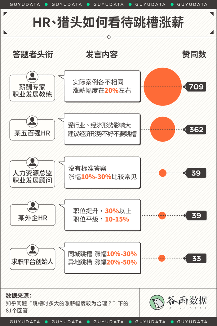 关于“跳槽时多大的涨薪幅度较为合理”的知乎问题下,HR和猎头们不约而同地分享了一条涨薪标准——同城跳槽涨幅一般在10%~30%,异地跳槽可以到20%~50%。
