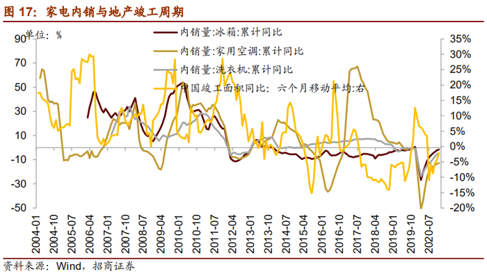 伴随着2006年以来的几轮地产竣工后周期,冰箱、空调、洗衣机等内销量均有较大提升。2005年6月开启新一轮地产周期,房地产竣工面积累计同比开始从底部回升,并在2006年6月六个月移动平均增速到达29%的区间高位。期间家用空调累计同比增速从2005年12月的-7.06%底部回升,2007年增速达到20%以上;冰箱内销量同比增速在2006年一直保持30%以上的增速;洗衣机内销量累计同比增速在2006年底开始回升,2007年保持20%以上的累计同比增速。2009年11月,地产竣工同比增速达到28.28%,随后2010年3月份,家用空调、冰箱内销量累计同比增速分别达到54.07%和53.93%的区间峰值。此后2011年、2014年、2016年地产竣工面积六个月移动平均增速达到峰值相应对冰箱、洗衣机、空调等的内销量均带来了明显的提振作用。2020年下半年随着地产竣工的回暖,冰箱、洗衣机、家用空调内销量同比增速也开始回升。整体来看,家电的内销略微滞后地产竣工1-3个季度。