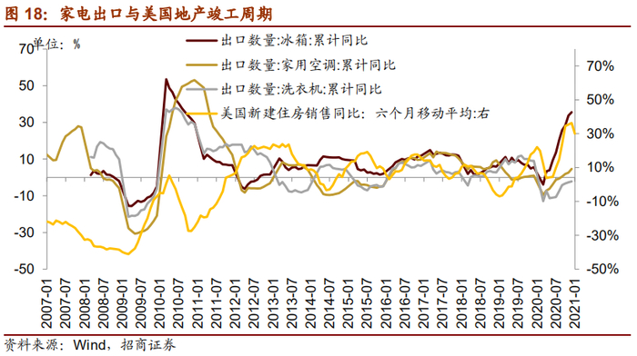 外销方面:2007年以来,我国空调、冰箱、洗衣机等出口量与美国新建住房销售也有明显的相关性。2009年3月份美国新建住房销售六个月移动平均同比增速开始回升,随后2009年3月和4月,我国冰箱、洗衣机、家用空调的出口累计同比增速拐点出现;2013年、2015年、2016年美国新房销售的提升均对我国的冰箱、空调、洗衣机等的出口带来相应的提升作用。2020年下半年开始,美国新房销售再次大幅提升7月达到峰值,我国洗衣机、空调、冰箱等出口累计同比在2020年初进入上行通道。