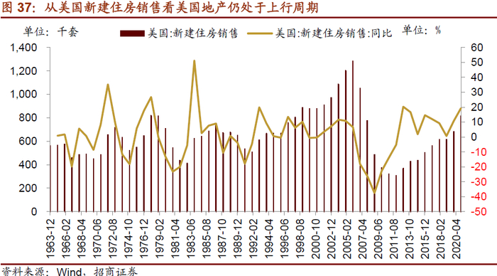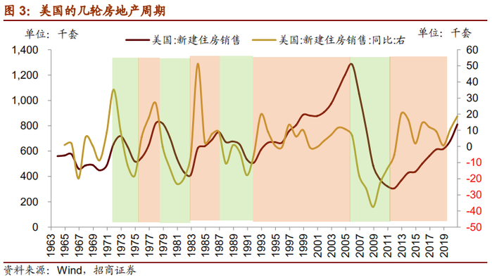 2006年-2020年为第四轮地产周期: 2001-2003年的短短两年时间里,美联储不断大幅调整利率,叠加当时美国政府设立联邦住宅贷款抵押公司和联邦国民抵押贷款协会,刺激房地产信贷业务迅速增长,导致房地产泡沫的大量累积,最终楼市泡沫破灭,造成了2008年以来的次贷危机。美国新建住房年销售套数从2006年的1051千套下降至2011年的306千套,下降近70.89%,尤其2008年同比跌幅扩大至37.5%,为1973年以来的最底谷。次贷危机后,美国通过出台《多德-弗兰克法案》等措施加强了对信贷机构和抵押贷款的监管,此后2012年开始美国房屋年销售套数从368千套上涨至2020年的811千套,此轮上行周期还未见顶。