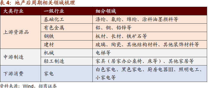 结合历次地产竣工周期行业及其细分领域的营收、超额收益等表现以及目前行业的估值和盈利修复空间,我们推荐关注地产后周期的相关领域,主要包括上游资源品的基础化工、有色金属、钢铁、建材;中游制造以电梯为代表的机械和以家具、其他家居为代表的轻工制造;以下游消费领域的白色家电、黑色家电、厨电、小家电等家电行业。