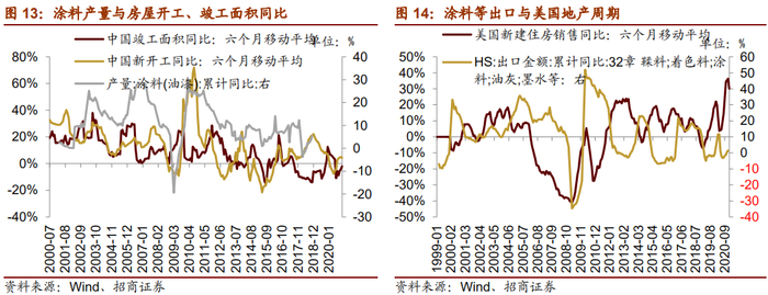 涂料产量累计同比增速与房屋新开工面积同比增速高度相关。2001年我国开启新一轮地产周期,房屋新开工面积同比增速开始回升,2002年3月份涂料产量累计同比增速开始上行;2005年初新开工和竣工回暖,2005年8月份涂料产量累计同比增速开始回升;2010年、2014年、2017年地产新开工面积同比增速(6个月移动平均)的上升,均带来涂料产量同比增速的上行。