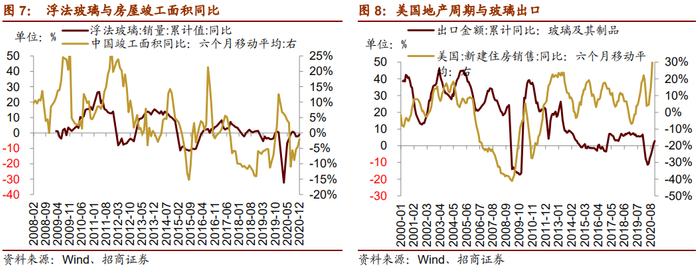 出口方面,我国玻璃出口与美国地产周期也存在较为明显的相关性。我们以美国新建住房销售六个月移动平均的增速来看,2002年3月份,美国新建住房销售同比增速触底反弹,我国玻璃出口同比增速几乎同一时期开始回升。2009年初美国新建住房销售当月同比从-41.1%底部回升,在2010年4月达到区间高点,几乎同期我国玻璃出口也从-17.2%触底反弹至39.2%的区间高点。2013年之前我国玻璃出口与美国新房销售相关性较高,2013年之后受国内去产能等因素的影响,玻璃出口震荡下行。整体来看我国玻璃出口大约滞后美国新房销售半年到2-3个季度。