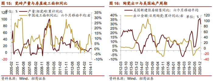 瓷砖产量累计同比增速与房屋竣工面积同比增速高度相关,尤其2008年之后。2008年底年,房屋竣工面积同比增速开始回升,2009年11月份房屋竣工面积六个月移动平均同比增速达到28.3%,10月份瓷砖产量累计同比增速达到100.9%的区间高点。2011年和2013年地产竣工增速的两次高点,均带来瓷砖产量累计同比几乎在同步的走势。
