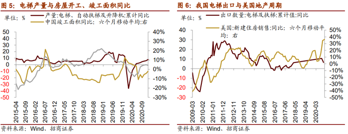 此外,我国电梯出口数量与美国地产周期也有较强的相关性。2010年美国新建住房销售同比底部回升,2010年六个月移动平均增速同比达到5.3%的区间高点,2009年底我国电梯出口累计同比增速开始回升,并在2011年持续维持20%以上的累计同比增速。2013年、2015年美国新建住房同比增速的区间高点同样带来我国电梯出口同比增速的上行。整体来看,我国电梯出口增速大约滞后美国新建住房销售2-3个季度。