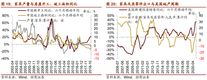 此外,我国家具及其零件出口与美国地产周期也有较强的相关性。历次美国新建住房销售六个月移动平均同比增速的上行,均带来了我国家具出口同比增速的提升。2009年3月份美国新建住销售六个月移动平均增速从底部-41.12%开始回升,随后我国家具出口在2009年7月开始上;2013年、2015年、2018年美国新建住房销售同比增速的峰值均带来我国家具出口峰值的出现。