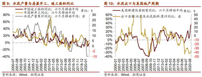 水泥出口方面,我国水泥出口与美国地产周期密切相关,2019年之后出现了短期的背离。2006年美国新建住房销售同比处于较高水平,我国水泥出口同比增速随后迎来一轮大幅上行。随着美国新建住房同比增速的下滑,我国水泥出口也在较长一段时间里处于下行态势。2009年美国新建住房销售同比底部回升,2012年达到区间高位,2009年中期水泥出口金额也开始触底回升。从过去几轮美国地产周期来看,每一轮美国新建住房销售同比增速的上行均会在随后的半年到两年时间里带来我国水泥出口的回升。2019年之后美国新建住房销售同比持续上行,由于疫情影响,我国水泥出口大幅回落,后续随着美国进入开工期,我国水泥出口有望重回上行通道。