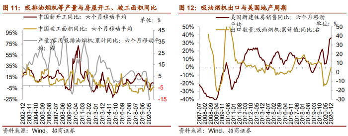 (1)根据施工进度将地产后周期划分为竣工前期、室内硬装和室内软装三个阶段。在这三个阶段中涉及到的电梯、玻璃、水泥、吸油烟机、涂料、瓷砖、家电、家具、纺织等细分领域,内外销与中国房屋竣工面积以及美国新建住房销售同比具有密切的相关性。