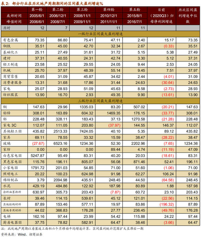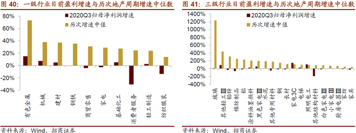 历次地产后周期都带来相关行业盈利增速的上行。过去五次地产后周期(根据竣工面积六个月移动平均增速划分),有色金属行业区间归母净利润同比(包含滞后一期)最大值的中位数为73.3%,机械行业区间盈利最大值的中位数为37.97%,建材行业区间盈利最大值的中位数37.3%,钢铁行业中位数为35.5%,家电行业中位数为28.9%,基础化工中位数27.5%,轻工制造和纺织服装区间盈利最大值的中位数分别为24.1%和13.9%。从2020年三季度的盈利增速来看,相比历次地产后周期,相关行业的盈利增速均有较大的修复空间。
