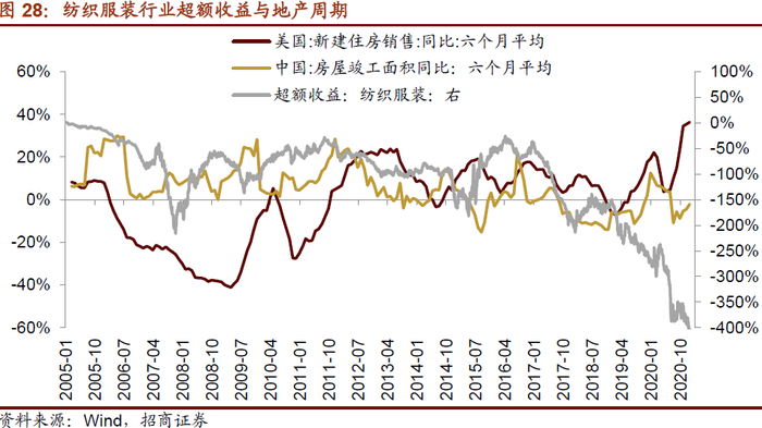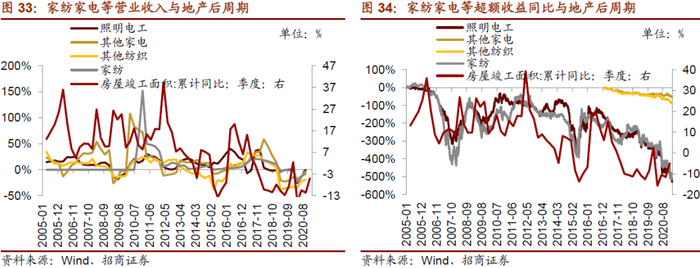 从行业超额收益来看,家电家纺领域的超额收益相比地产竣工面积同比增速有略微的滞后,但整体趋势极为一致。