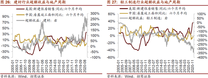 其次,建材、轻工等行业超额收益的提升基本都由于地产竣工的驱动。