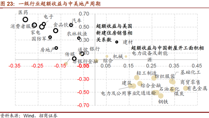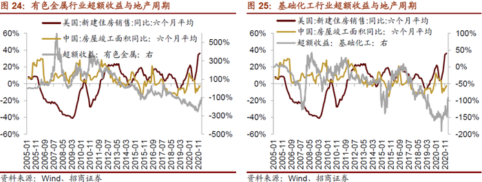 我们以2005年作为基期,计算中信一级行业相比万得全A的超额收益。可以发现有色金属、基础化工、建材、纺织服装、轻工制造等与我国新屋开工面积具有较强的相关性;而家电等与美国新房销售面积具有较强的相关性。