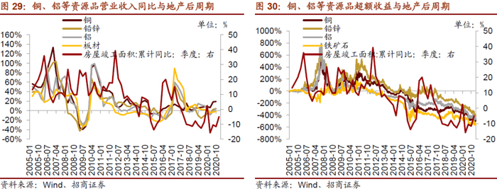 (2)从行业超额收益与中美地产周期的相关性来看,有色金属、基础化工、建材、纺织服装、轻工制造等与我国新屋开工面积具有较强的相关性;而家电等与美国新房销售面积具有较强的相关性。细分领域方面,资源品领域中的铜、铝、铅锌、铁矿石,建材、轻工领域的玻璃、其他轻工、其他家居等以及照明家电、家纺、其他纺织等营收同比增速和超额收益与地产后周期的走势有明显的一致性;