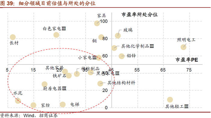 细分领域来看,目前家电领域的厨房电器市盈率19.15,处于历史27.21%分位;小家电目前市盈率40.01处于历史57.82%分位,黑色家电目前市盈率36.91处于历史40.94分位;纺织服装领域的家纺目前市盈率14.87处于历史2.93%分位,棉纺制品目前估值31.59处于历史39.03分位;建材领域的水泥目前市盈率8.9处于历史7.9分位,其他结构材料目前估值40.61处于历史27.9分位。此外铜、铅锌、长材、玻璃、家具等细分领域相比其他行业目前估值也较低。
