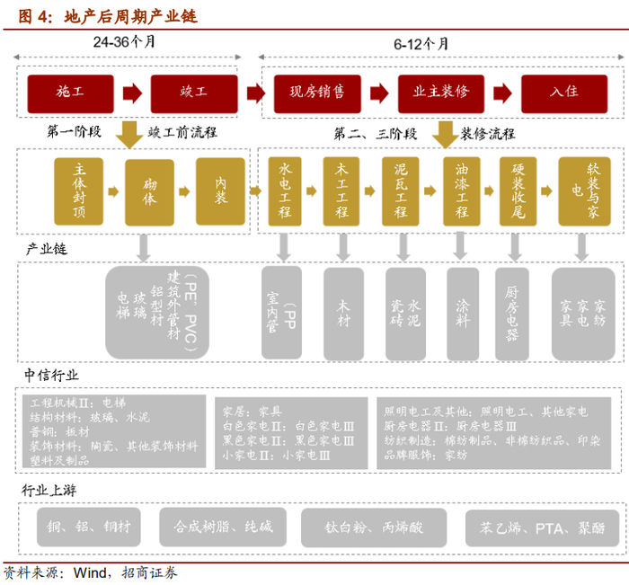 ⚑ 第三阶段:软装阶段:这一阶段主要是家具、家电等的配置。主要对家电、棉纺制品、非棉纺制品、印染等纺织制造以及以家纺为代表的品牌服饰的需求有较大幅度的提升。同时对产业链上游的铜、铝、苯乙烯、PTA、聚酯等原材料带来较大的推动作用。