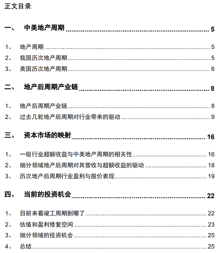 以上我们梳理了中美历次地产周期与相关产业链、在历次地产后周期中电梯、玻璃、水泥、吸油烟机、涂料、瓷砖、家电、家具纺织等细分领域的内外销情况以及在过去几次地产后周期中相关领域的营收增长和超额收益情况,站在当前时点,我们得出以下结论: