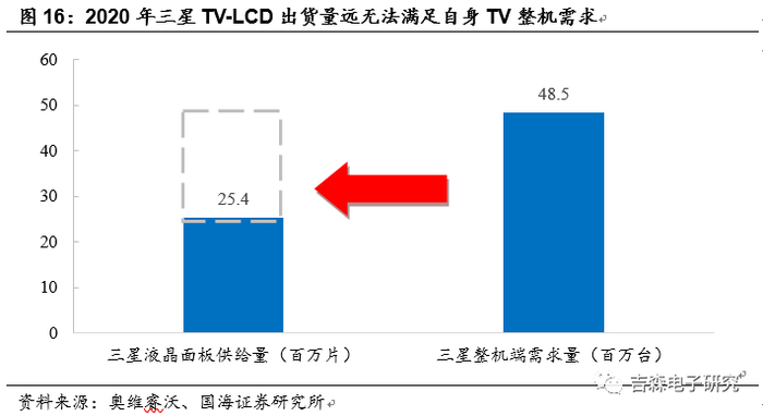 短期来看,LG盈利需求旺盛,而三星自家TV品牌对面板的需求难以满足,韩厂延后关闭剩余产线在情理之中。当前LG延迟退出LCD产能主要是出于面板价格上涨有望弥补此前产线的明显亏损,而三星情况略有不同,2020年三星TV整机的面板需求为4850万片,而自身供给仅为2540万片,本身需要较大的外采来维持,若在当前缺货严重的情境下关闭LCD产线则有可能导致整机端无法优先拿到面板,导致三星整机品牌份额被蚕食,对集团业务产生更多压力。