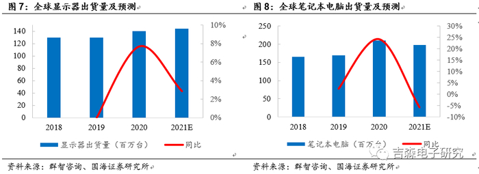 线上化助推PC市场二次增长,显示器和笔记本LCD出货量同比快速上涨。受疫情在全球范围内影响时间持续,教育、办公线上化对PC的需求持续旺盛,推动PC市场二次增长,PC市场(含笔记本电脑)与TV市场类似,整体也处于一个存量市场竞争的状态,下游品牌集中度很高,联想、戴尔、惠普、苹果几大厂商占据了绝大部分市场份额。根据群智咨询数据,2020年全球显示器出货量达到1.4亿台,同比增长7.69%,2020年笔记本电脑出货量达2.1亿台,同比大增24.26%,我们认为,即使后续全球新冠疫苗接种乐观,疫情对人类生活习惯产生的影响不会迅速消失,线上化需求仍将长期存在,根据群智咨询预测,2021年显示器和笔记本电脑出货量预计分别为1.44亿台和1.98亿台,增速虽大幅放缓,但较疫情前水平仍有明显增量。
