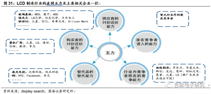 面板行业竞争格局将长期改善。根据波特五力模型,我们可以看到面板制造环节的竞争格局改善具备持续性的基础,行业内竞争者和潜在进入者方面,中小厂商很难再冒着大幅扩充产能、打乱市场供需关系的风险去新建高世代产线, LG、三星等显示大厂已把研发力量全面转向OLED、QLED领域,对他们而言,效仿日本厂商的做法,在液晶面板领域巩固自身在显示材料和设备领域的优势更为合理,面板行业投资周期长,门槛相对高,目前并无行业外潜在进入者;替代品方面,激光电视、VR当前对液晶TV替代能力有限,成本和体验还未达到理想状态,短期内造成的威胁较小,下游整机厂方面,品牌客户掌握较大渠道优势,但相对而言缺乏技术壁垒和资金壁垒,面板厂对购买者的议价能力有望提升;供应商方面,大多数面板材料技术壁垒仍较高,具有较强的议价能力,以玻璃基板为例,NEG、康宁和AGC三家企业占据了市场绝大部分产能,垄断力较强,综合来看,我们认为我国面板龙头竞争优势将持续扩大,而面板制造环节在产业链中地位也将提升,享受长期盈利红利。