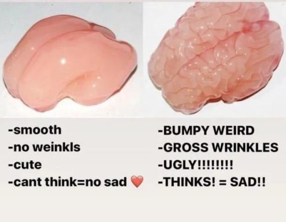 这其实是一种理想状态。这是继“银河系大脑”之后的下一步,因为唯一比在疫情中成为天才更好的事情,就是在智力上不受大规模悲痛的束缚。人们正在庆祝“光滑的大脑星期六”,追逐理想的夏季氛围:“光滑的皮肤,光滑的大脑”。有一个两张图片拼在一起的模因被热传:左图中是一块光滑鲜亮的生鸡胸肉,标题是“不能思考=不悲伤”(Cant think=no sad);右图是生物教科书上的健康大脑图片,大脑皱纹丛生,诡异的半透明状,颜色像金枪鱼罐头。这二者之间,选择似乎很明显。