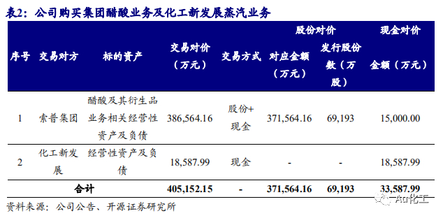 公司购买控股股东醋酸业务及化工新发展蒸汽业务。根据公司公告,2019年12月公司进行资产重组,通过发行股份及支付现金的方式购买索普集团醋酸及衍生品业务相关经营性资产和负债以及索普集团控股子公司化工新发展的蒸汽业务,两项业务的交易对价合计为40.52亿元。其中公司通过向索普集团发行69,193万股以及支付现金对价1.5亿元,收购索普集团醋酸及其衍生品业务。此次交易前,索普集团控制公司17,516.35万股股份,控制公司57.16%的股权,为公司的控股股东;重组完成后(不考虑配套募集资金的影响),索普集团控制公司股权比例为86.85%,索普集团仍为公司的控股股东。