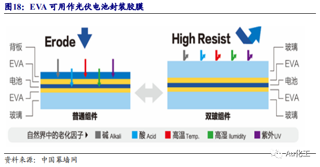 EVA可用作光伏电池封装胶膜。根据全球新能源网,EVA由乙烯和醋酸乙烯(VA)两种单体经共聚反应而得,其中VA的质量分数在5%-40%,由于其良好的性能,产品被广泛用于发泡材料、功能棚膜、包装膜、注塑吹塑制品、调和剂以及粘合剂、电线电缆,光伏电池封装胶膜以及热熔胶等领域。2020年为光伏补贴的最后一年,许多国内的头部组件厂商纷纷宣布扩产,且随着光伏组件尺寸多样化,双面双玻组件的渗透率大幅提升,光伏组件需求超预期增长,刺激EVA需求增长。根据卓创资讯数据,2021年将有80万吨EVA产能投产。根据我们测算,80万吨EVA产能增长,将带动每年14.4万吨醋酸乙烯需求增长,从而带动每年10.37万吨醋酸需求增长。