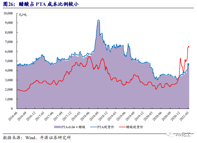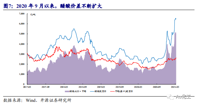 PTA对醋酸价格上涨并不敏感。醋酸下游消费主要为PTA,1吨PTA仅需0.04吨醋酸。按PTA加工费500元每吨、含税完全成本3,500元/吨计,即使醋酸含税价格上涨至6,000元/吨,醋酸也仅占PTA总成本的6.86%。因此醋酸价格上涨对下游PTA生产的影响有限,为醋酸价格上涨提供了充足空间。