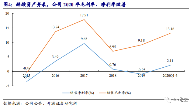 受新冠疫情影响,公司醋酸业务业绩承压。2020年,受新冠疫情影响,公司在2020年上半年遭遇了产品销路不畅、库存商品增加、产品出厂价大幅下降等实际困难。根据公司2020半年报,公司核心产品醋酸的市场行情在2020年上半年下跌严重,公司上半年醋酸产品销量及出厂价相较2019年同期分别下跌17.9%和18.4%。面对行业出现的库存超历史高位、产品价格持续下调的严峻形势,公司在市场价格较低的点位及时进行装置停车检修,为公司后续安全、稳定、持续生产创造了条件。受此影响,2020年上半年,尽管公司实现归母净利润850.20万元,较2019年扭亏为盈,但仍低于公司2019年重大资产重组后的序时计划,醋酸业务整体承压。随着醋酸价格回暖,公司2020年Q3业绩显著回暖。2020年Q3单季度,公司实现营收10.20亿元,同比增长1,114.86%;实现归母净利润4,472.89万元,同比增长859.55%。