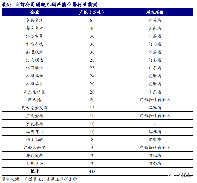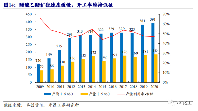 醋酸乙酯行业产能扩张缓慢。根据卓创资讯数据,2009年-2016年,醋酸乙酯产能持续扩张,年均复合增长率达15.57%。2016年醋酸乙酯行业名义产能为329万吨。2017年及2018年,因广西利而安转产醋酸丁酯,泰兴金江、江门谦信调整醋酸乙酯装置的产能数据,总体产能略微下滑。2017年和2018年,醋酸乙酯行业产能分别为329和325万吨。2019年醋酸乙酯行业产能扩大,泰兴金江新增醋酸乙酯产能30万吨/年,鲁南兖矿新增产能20万吨/年,宁夏睿源新增产能10万吨/年。另外,2019年上海华谊淘汰了10万吨醋酸乙酯装置。目前醋酸乙酯行业总产能为415万吨,公司实际有效醋酸乙酯产能为30万吨/年,产能规模位于行业前列。自2014年以来,国内醋酸乙酯产量随表观消费量变化,持续小幅震荡。目前国内醋酸乙酯供给过剩,开工率持续低于60%,我们预计短期内醋酸乙酯产能扩张程度有限。
