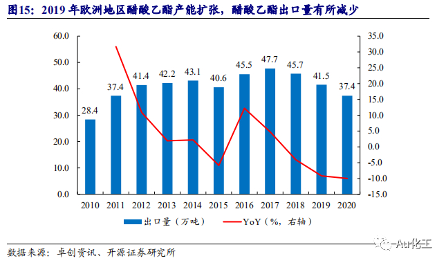 国内醋酸乙酯供给过剩。中国是世界上最大的醋酸乙酯生产国,根据卓创资讯数据,2019年国内醋酸乙酯产能达到381万吨,产量达181万吨,而表观消费量仅有140万吨,醋酸乙酯供给过剩,过剩产能主要往日本、中国台湾、印度尼西亚等东南亚及东北亚国家和地区出口。2013年以来我国醋酸乙酯出口量变化并不明显,2019年欧洲地区醋酸乙酯产能扩张,醋酸乙酯出口量有所减少。2019年醋酸乙酯出口量为41.54万吨,同比减少9.18%。