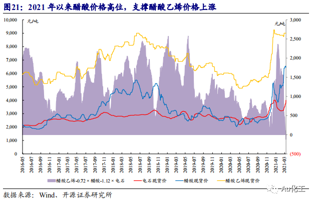 2021年国内外多套醋酸装置意外停车,醋酸价格创近年新高。2021年1月份,河南顺达40万吨醋酸装置意外停车,至今装置未重启;2月份,塞拉尼斯位于美国德州的醋酸装置受到寒潮影响停车,刺激醋酸价格快速上涨。根据化工在线,塞拉尼斯的德州基地醋酸产能共130万吨。在国内外醋酸装置停车的影响下,全球醋酸景气提升,外盘报价上涨,推动国内醋酸价格达到近年来的高位。根据Wind数据,目前醋酸现货价格达到6,450元/吨,创2018年以来的新高,而年初价格为4,400元/吨,累计涨幅已达46.59%。