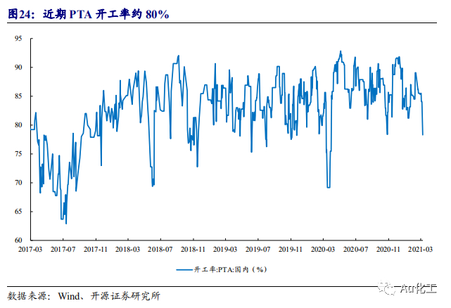 2020年上半年醋酸需求疲弱,多数醋酸装置彼时借机检修。受新冠疫情影响,2020年醋酸下游产业复工时间推迟,醋酸需求持续低迷。醋酸厂商在库存积压的情况下下调开工负荷,叠加3-4月国内醋酸需求低迷,醋酸生产装置集中停产检修,根据百川盈孚数据,2020年上半年醋酸开工率仅68.4%。随着国内经济持续复苏,下游PTA开工率高企。根据Wind数据,截至2021年3月8日,PTA行业开工率为78.31%。2020年Q3开始,醋酸价格不断上涨,醋酸行业开工率亦不断走高。截至2021年3月8日,醋酸行业开工率为82.81%。
