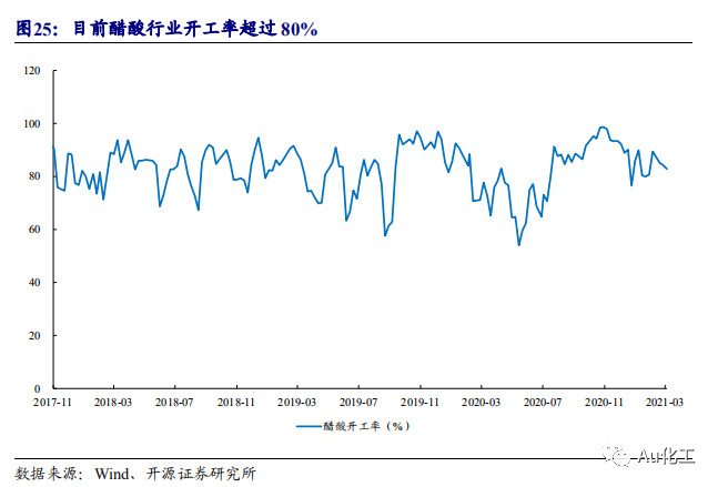 未来醋酸或仍将处于供需紧平衡状态。新增产能方面:根据卓创资讯数据,华谊集团拟建50万吨/年与70万吨/年醋酸,预计分别于2021年5月与2021年12月底投产。若醋酸新增项目顺利投产,则2021年醋酸行业有效总产能将达到985万吨。考虑到新增醋酸产能尚需经历产能爬坡期,我们保守测算,2021年全年醋酸行业总产量为821.38万吨。