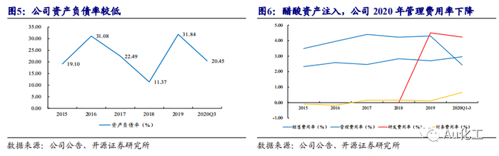 公司资产负债率较低。2015年以来,公司资产负债率最高仅31.84%,因为财务费用率一直处于低位。随着醋酸资产注入,公司管理费用率有所下降。2020年,受新冠疫情及检修影响,公司2020年上半年醋酸装置运行状况并非常态。2020年Q3,醋酸价格逐渐回暖,公司醋酸装置运营相对常态化,我们认为公司Q3费用率较为接近正常水平。根据公司公告,2020年Q3单季度,公司销售费用率、管理费用率、财务费用率分别为2.99%、2.02%和0.63%。